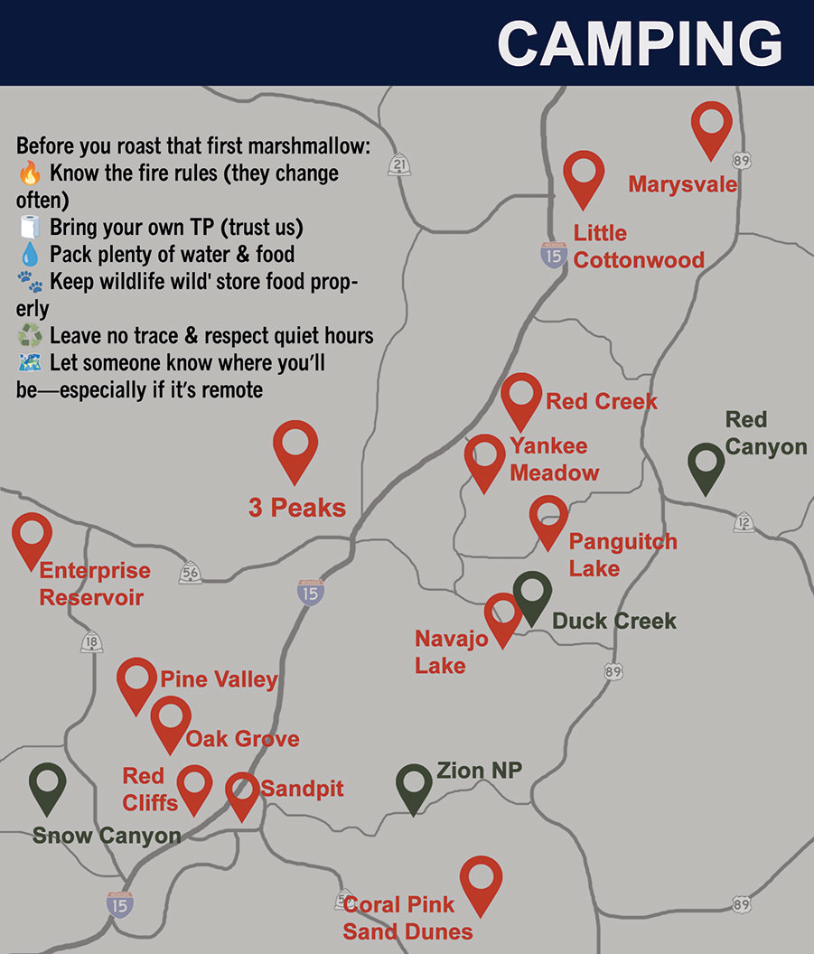 Camping in Southern Utah CAMPING EVENTS DIRECTORY CAMP SITES Events 04 Sep 04 Sep - 06 Sep Rails To Ridges Paiute SXS Adventure 09-04-2026 @ 05:00 PM - 09-06-2026 @ 06:00 PM Sevier Utah Other Paid 26 Mar 26 Mar - 29 Mar Debbie’s Birthday Ride Caliente to Mesquite Weekend w/ Triple S Polaris 03-26-2026 @ 08:00 AM - 03-29-2026 @ 02:00 PM Caliente NV Networking Event or Meeting Free 16 Jan 16 Jan - 18 Jan Pack Baskets in Kanab 01-16-2026 @ 09:00 AM - 01-18-2026 @ 05:00 PM 42 E Center St, Kanab, UT Class or Workshop Paid Coming Soon. please check back. Camping Directory Where to Find Local Bridal Shows in Southern Utah Beating the Heat in Duck Creek: RZR Riding Through Southern Utah’s High Country Kane County Relocation Guide