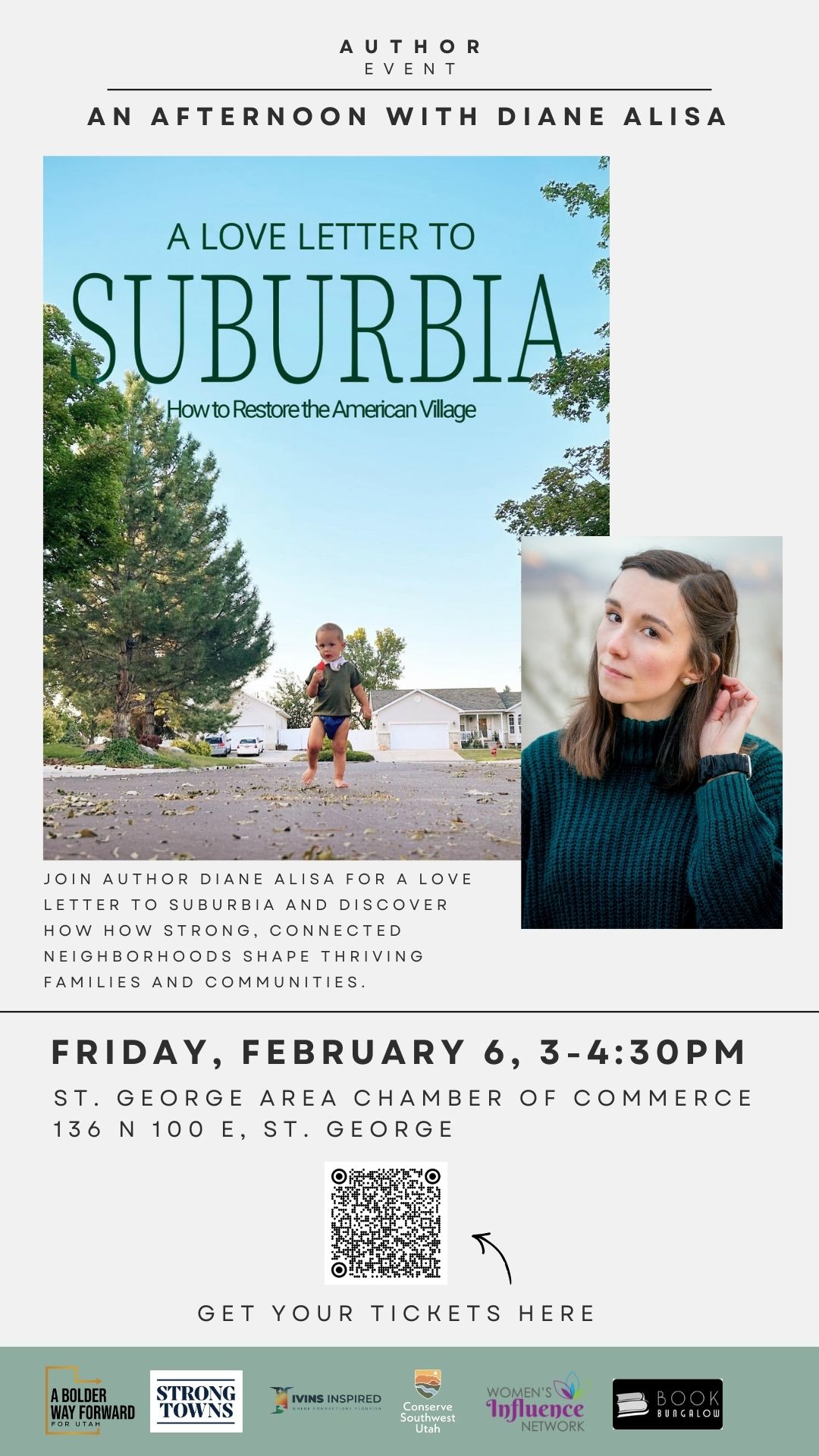 Love Letter to Suburbia: An Afternoon with Diane Alisa Join Diane Alisa, social media influencer and author of A Love Letter to Suburbia: How to Restore the American Village, for an engaging afternoon conversation about the future of our neighborhoods and the power of community. Diane explores how suburban life can be reimagined to foster connection, sustainability, and belonging. She shares stories and insights on how we can create neighborhoods that are walkable, people-centered, and thriving, offering practical inspiration for residents, local leaders, and advocates alike. This event is an opportunity to: Reflect on the places we live and how we can strengthen our communities Connect with others who care about sustainable, resilient, and vibrant neighborhoods Engage directly with an author whose work celebrates local identity, stewardship, and the potential of our shared spaces Date: Friday, February 6 Time: 3:00 – 4:30 PM Location: Saint George Area Chamber of Commerce Hosted by Conserve Southwest Utah in partnership with the Strong Towns Washington County Coalition, the Women’s Influence Network, Book Bungalow, and A Bolder Way Forward this event is designed to spark conversation, ideas, and action for building stronger, sustainable, more connected communities. Questions? Contact desertlivability@conserveswu.org